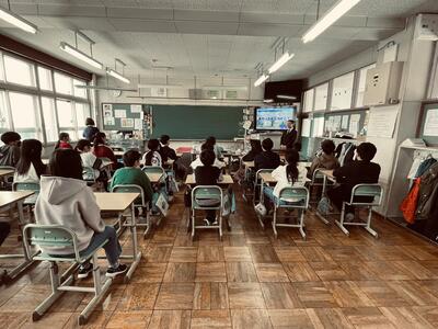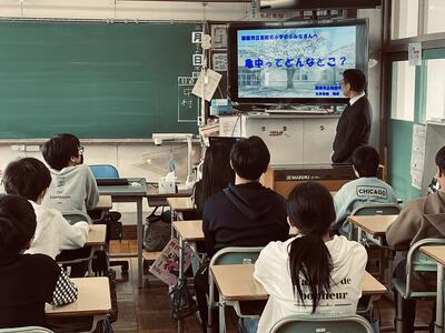 亀田中学校の先生に中学校に来ていただき、中学校の紹介をしていただきました。